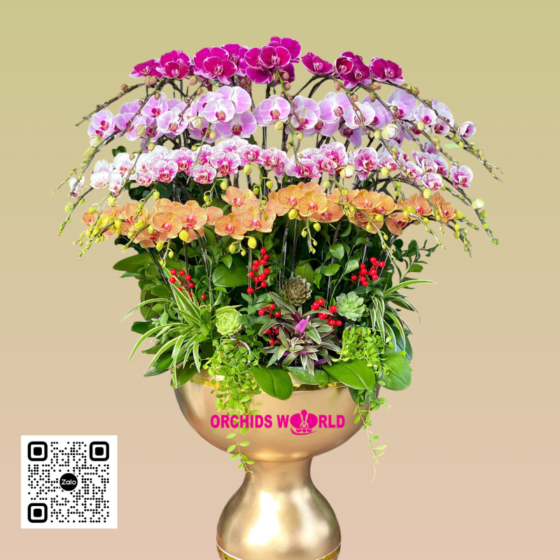 Ngay từ ánh nhìn đầu tiên, chậu lan hồ điệp mix màu hoành tráng đã tạo ấn tượng mạnh mẽ bởi quy mô hoành tráng, màu sắc rực rỡ nhưng được phối cực kỳ tinh tế. Đây không chỉ là một chậu lan trang trí, mà là món quà mang thông điệp chúc mừng – thịnh vượng – phát triển bền vững, đặc biệt phù hợp cho kỷ niệm thành lập, khai trương, chúc mừng đối tác lớn.