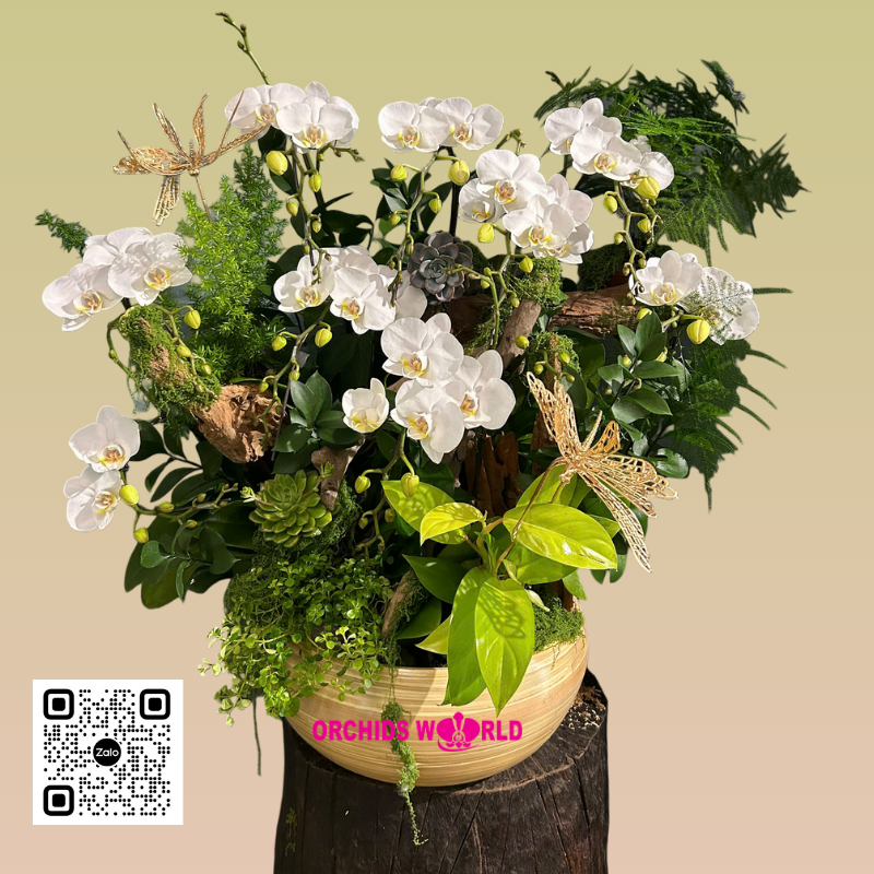 Tiểu cảnh xanh mát được phối hợp khéo léo với rêu xanh, sen đá, cây lá rũ và dương xỉ, tạo cảm giác gần gũi thiên nhiên, sinh động nhưng vẫn gọn gàng, không rối mắt, làm nền hoàn hảo để lan hồ điệp trắng nổi bật. Chậu tre dáng tròn màu be nhạt với gam màu trung tính giúp tôn sắc trắng của lan, dễ dàng phù hợp nhiều không gian như phòng khách, bàn tiếp khách, văn phòng hay quầy lễ tân.