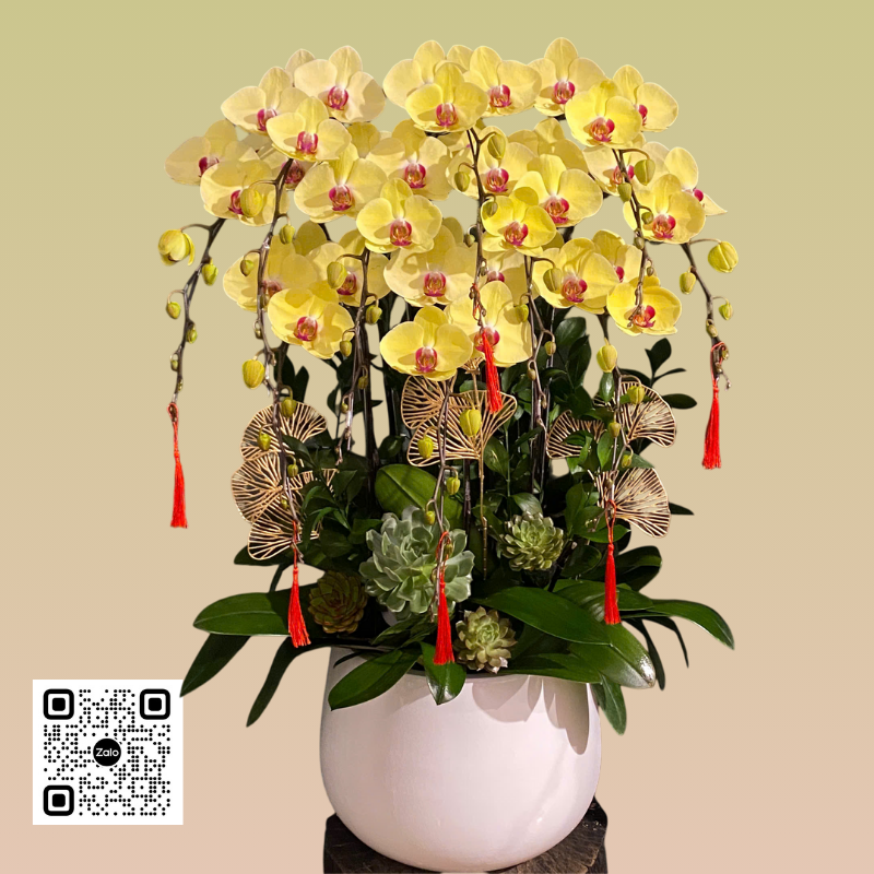 Sắc vàng tươi tắn, mang ý nghĩa của tài lộc, phú quý, khởi đầu thuận lợi. Chính vì thế mỗi dịp Tết đến xuân về, nhà nhà đều chọn cho mình 1 chậu lan hồ điệp vàng rực rỡ. Thêm vào đó, sen đá mang ý nghĩa bền bỉ, ổn định với hy vọng giữ được tài khí trong nhà. Ngoài ra số 10 cũng là 1 con số rất đẹp, mang ý nghĩa tròn đầy, viên mãn.