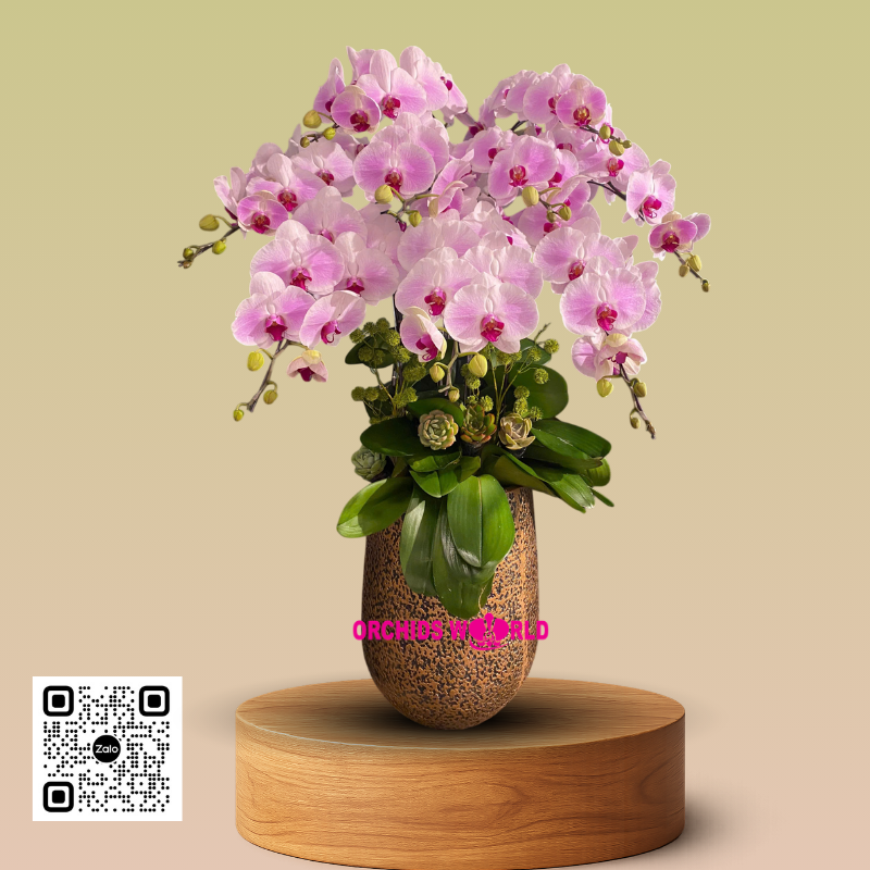 – Chậu Lan Hồ Điệp 9 Cành Hồng gồm 9 cành lan sắc hồng phớt với một vẻ đẹp sa hoa và lộng lẫy đem lại cuộc sống tốt đẹp và hạnh phúc đến cho mọi người. Lưỡi hoa đỏ nổi bật trên nền hồng trắng tươi thắm tăng thêm sự quyến rũ cho những cành lan khiến những người yêu hoa cũng phải yêu quý. Nhờ bàn tay khéo léo và kì công của những người thợ công ty chúng tôi đã cắm hoa theo cấu trúc 3 tầng, tầng 1 gồm 2 cành, tầng 2 gồm 3 cành, tầng 3 gồm 4 cành thể hiện sự ngọt ngào và viên mãn trong tình yêu.Chậu lan được trang trí với những cây sen đá xinh xắn đã tạo nên một chậu lan hoàn hảo và sang trọng đầy đủ sắc màu..