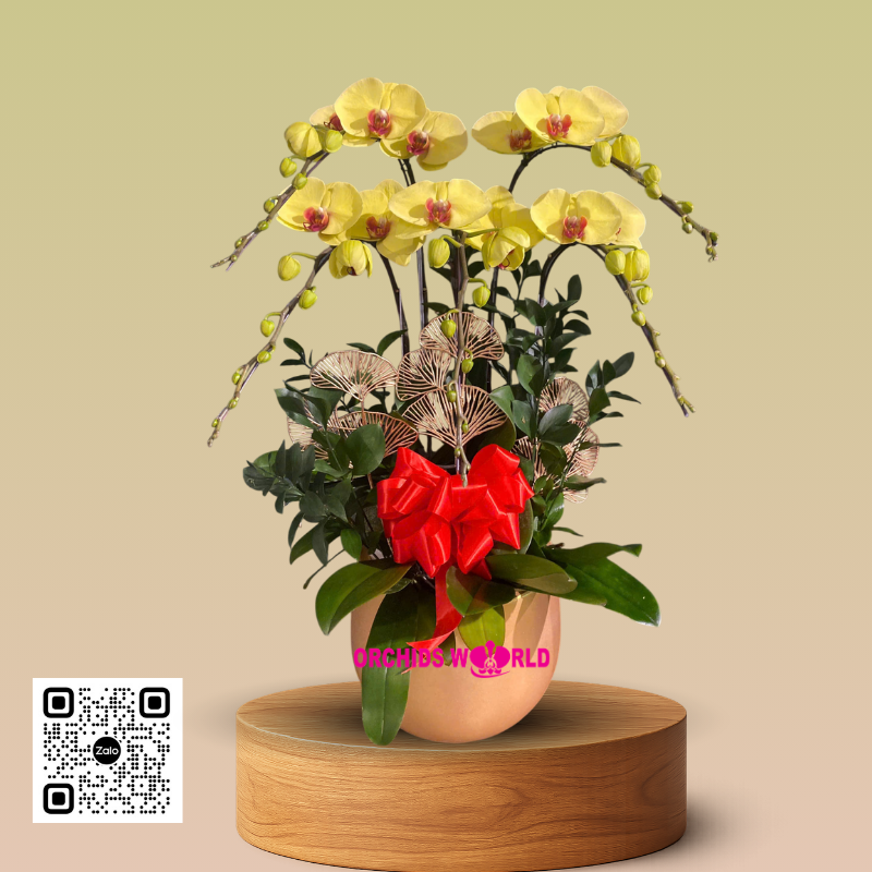 Chậu Lan Hồ Điệp Vàng 5 Cành gồm 5 cành lan vàng với những bông hoa to tròn, xinh xắn tạo thành 2 tầng hoa được ghép khéo léo vào chậu men sứ trắng sang trọng. Tầng 1 gồm 2 cành lan, tầng 2 gồm 3 cành lan với những bông hoa nở rộ, cánh hoa to dày, xếp đối xứng vào nhau như những con bướm đong đưa trong đưa trong nắng mai chào đón ngày mới. Màu vàng tươi mới kết hợp với màu đỏ tươi thắm làm cho chậu lan càng trở nên bắt mắt, thu hút bao ánh mắt người ngắm nhìn, khiến bao người đem lòng yêu quý. Hơn nữa, một chiếc nơ đỏ nhẹ kết hợp những lá vàng tạo nên vẻ đẹp hài hòa, không hề kém phần tinh tế và sang trọng
